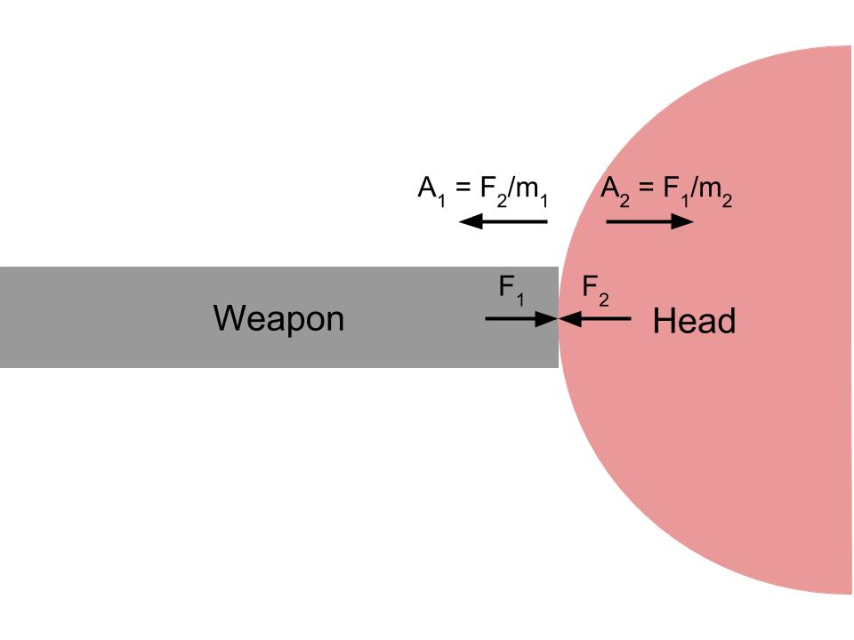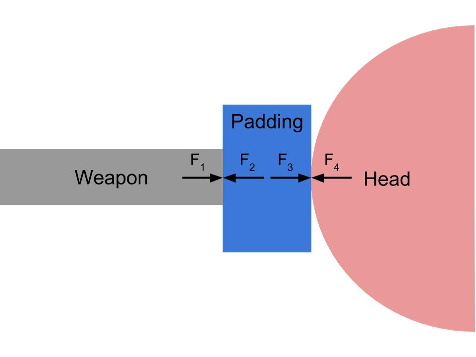 Consider the illustration provided above. As before, when the weapon strikes, it applies some amount of force, F1 to the padding. As a result of Newton’s Third Law of Motion, we therefore know that F2 = -F1 just like before. If this level of force exceeds the inertia of the padding, then the padding will begin to accelerate towards the head. Now, the reason that it is important that padding functions like a spring is that this allows the front surface (the side closest to the weapon) to accelerate separately from the back surface (the side closest to the head). When this happens, the padding is compressed and the distance between the two surfaces becomes closer by some amount d– the displacement. We also know that according to Hooke’s law, the amount of force required to compress the padding is calculated using the equation F = -k*d where k is the spring constant that describes how stiff the padding is. The materials that are used to pad SCA helmets have relatively low k values, generally speaking, but that’s not particularly important to understanding why padding doesn’t prevent acceleration of the head. When the padding compresses (due to F1), Hooke’s Law tells us that a linearly increasing amount of force is required to compress the padding further. However, for any given moment of time, the padding itself will be attempting to expand by exerting an equal amount of force in both directions. This means that regardless of the amount of compression, the force on the front side of the padding, F2 will always be equal in magnitude (and opposite in direction) to the force on the other side of the padding, F3, or expressed mathematically F2 = -F3.