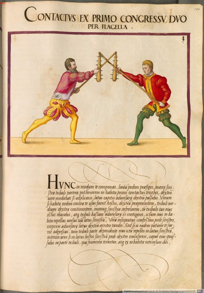 If your enemy has used the same position against you who are holding forward your right foot[5] and gripping the middle of your flail with the right hand and the lower end with the left, you will meet his blow with your flail[6], and if you will have touched the flail-body of your enemy’s flail,[7] you will repel his strike turning him to your left flank from this position. Then immediately, you following with your left foot, you will beat sharply the right flank of your enemy’s body.