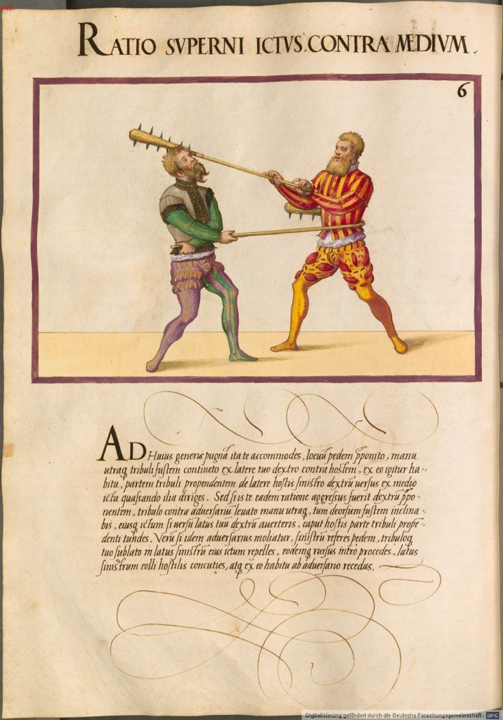 If your adversary will attempt the same, you will draw back the left foot, and you will repel the blow of his on the left flank with your flail raised, and you will proceed again with the same, you will strike the left flank of the enemy’s neck, and you will withdraw from this position.