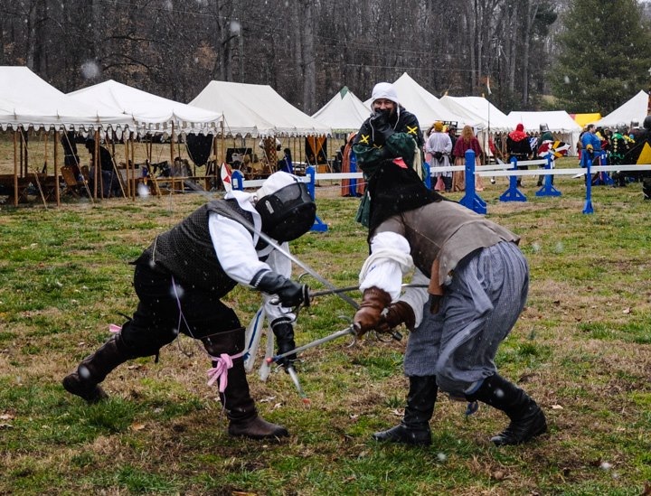 It was low 30’s, snowing intermittently, raining intermittently, and miserable. I kept thinking “We should’ve been practicing outside during the winter!” I also kept thinking “I should’ve put on my silk sock liners” and “I should’ve been practicing with my silk glove liners on so I could fight with them on in the tournament” and “OH FUCK OH FUCK IT’S COLD!” I kept my mask and hood on, and my wool cloak, at all times when I wasn’t fighting so I could stay warm, and vibrated up and down.