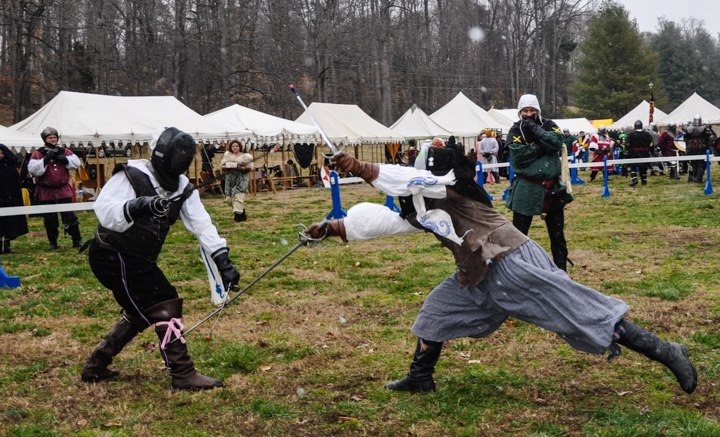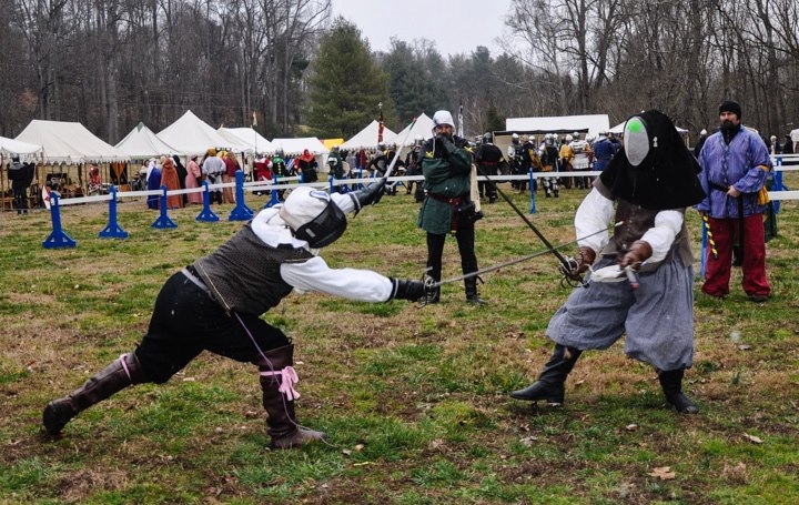I pulled Master Alan at some point, and realized I hadn’t fought him in anything like a “real” setting since Holiday Faire 2008. Thanks to the joys of the Provost e-mail list archives I know I did not impress him then (scotch and an unplugged keyboard) but also have had very complimentary things said to me, by him, since then. Early on I tried my big-ass snap lunge on him, he backed out, and we both acknowledged “well it was worth a try.” I like that shot because a) it usually disrupts my opponent’s initial planning in the fight, b) it might score the touch and make my life easy, c) it scares people, and d) usually it risks me very little because I automatically spring back from it. A short while later I landed a low center-line lunge on him.